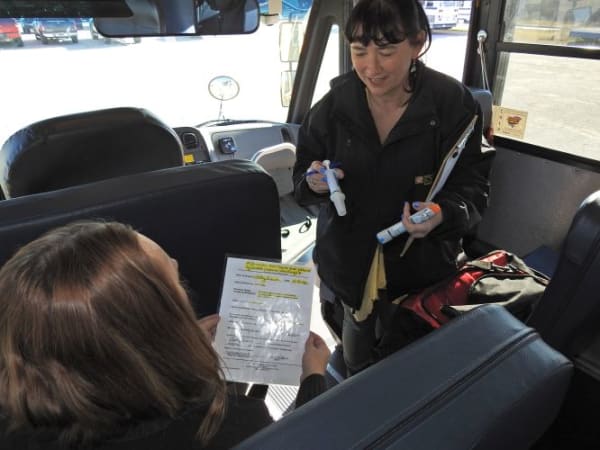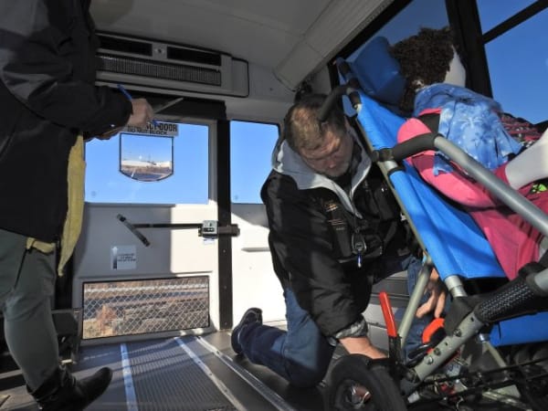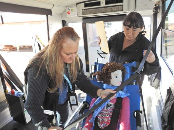Here, a driver demonstrates his ability to properly secure wheelchair retractors.