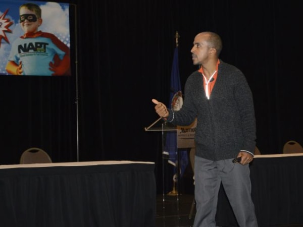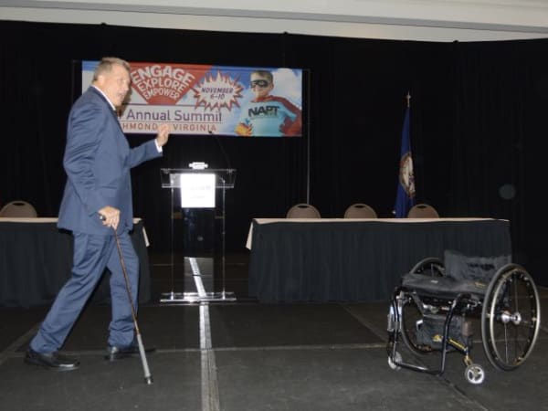 Scott Burrows told NAPT and NASDPTS members about the car accident that left him paralyzed from the chest down and how he worked hard to regain use of his limbs. “You can choose to be bitter, or you can choose to be better,” he said.