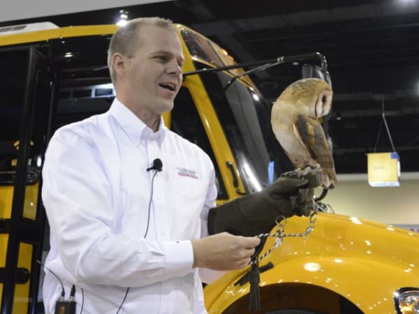 Thomas Built Buses CEO Caley Edgerly made connections between the company’s new BusWise technology platform and the capabilities of a barn owl — both are “sensitive, efficient and intelligent,” he said. Edgerly brought that point to life by bringing out a real barn owl.