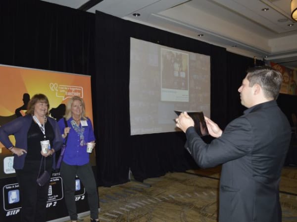 New York directors of transportation Cheryl Dalton (left) of Saratoga Springs City Schools and Dawn Russell of Monroe-Woodbury Central School District get their picture taken at the Transfinder “selfie station.”