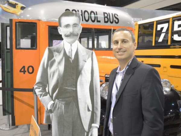 School Bus Fleet General Manager James Blue poses with a likeness of Perley A. Thomas, founder of Thomas Built Buses. The manufacturer is celebrating its 100th anniversary in 2016.