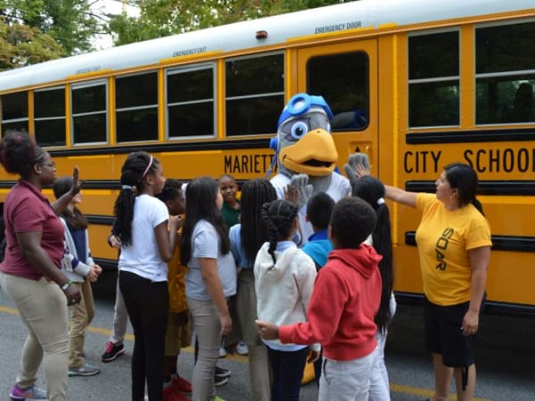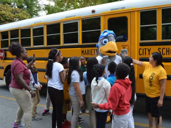Marietta students going through the SOAR school bus safety program meet the district’s SOAR eagle mascot.
