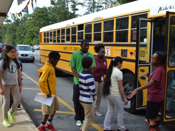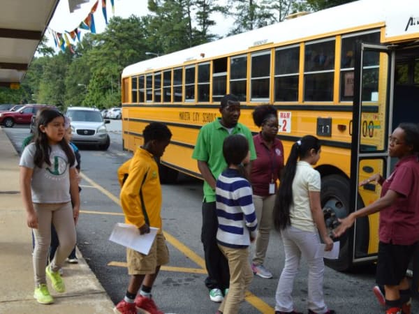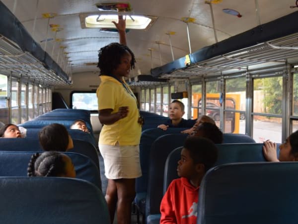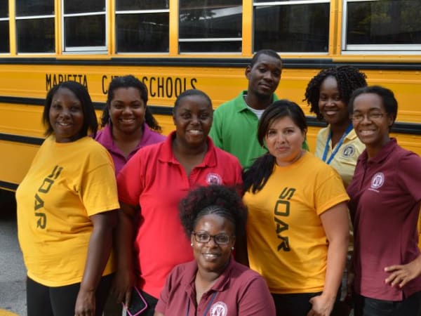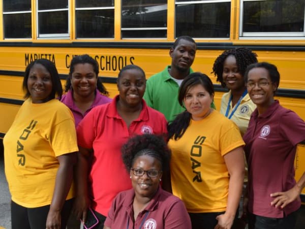 For the SOAR program, school bus drivers go to schools and lead students through six stations that cover key safety topics. Seen here are SOAR team members at Marietta (Ga.) City Schools.