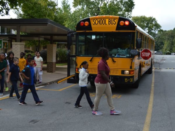 Students board a Marietta bus during the SOAR training. The program’s six stations cover such topics as evacuation, the danger zone, and how to cross the street safely.