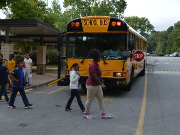 Marietta students learn how to cross the street safely in front of the bus in one of the SOAR stations.