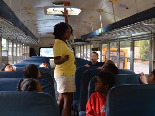 A Marietta school bus driver on the SOAR team shows students a roof hatch, one of the emergency exits on the bus.
