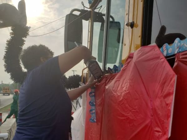 Seven school bus drivers and monitors worked for about three weeks to decorate the bus. They also attached magnets to the bottom of the hat to keep it affixed to the roof of the bus.