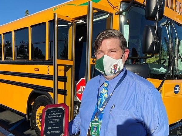 Joe Aldridge, superintendent at Columbia (Calif.) Union School District, posed in front of one of the district's two new Blue Bird electric buses after they were delivered by A-Z Bus Sales in early October. The buses were delivered as part of California’s school bus replacement plan using VW funds.