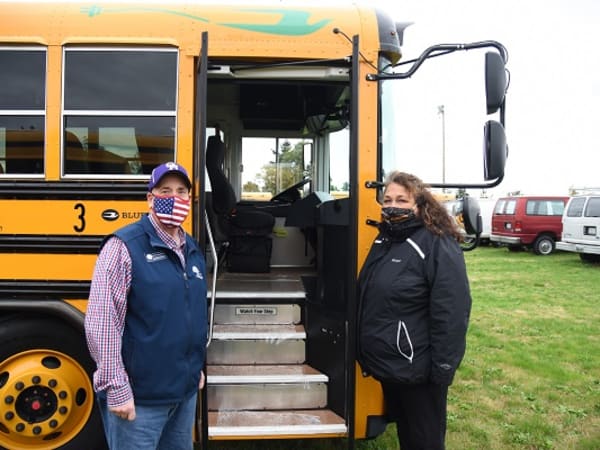 In November, Oak Harbor (Wash.) Public Schools added its first electric school bus to its fleet after securing a $302,685 VW settlement grant from the Washington Department of Ecology. Shown here is Francis Bagarella, the district’s transportation director, and Cathi Gutierrez, the district's assistant transportation director.