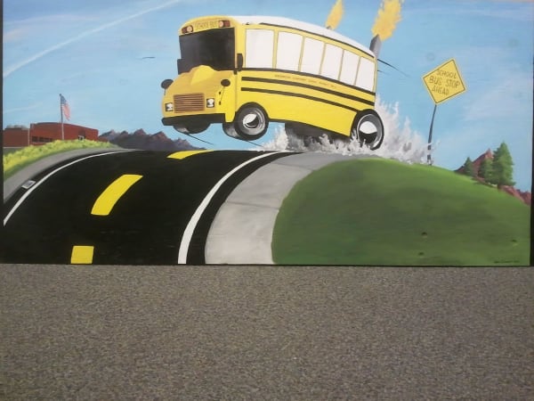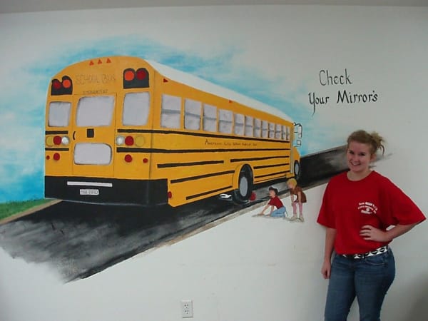 This mural is painted on the wall of the drivers lounge at American Falls (Idaho) School District #381. Pictured is the artist, Paige Weisenburger, who is the daughter of Director of Transportation Howard Weisenburger. Weisenburger says that Paige painted the mural as part of her senior project, which was aimed at keeping children safe. He and Paige discussed the issue of drivers checking their bus mirrors, which became the subject of the mural. Her senior project also included a presentation to sixth-graders about the school bus danger zone.