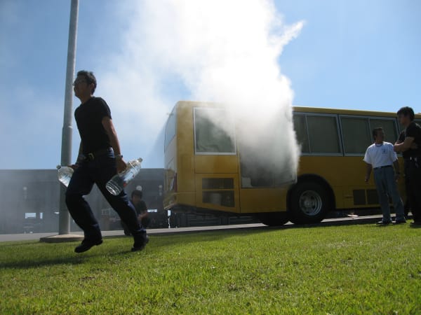 The staff at the DoDEA-Pacific Misawa (Japan) Student Transportation Office spends time in the summer doing roadeos and timed bus evacuation drills, like the one pictured here. "In the week before school resumes, we take a bus to the fire department, which fills the bus with mineral oil vapor ‘smoke,"' explains Christopher Zeitvogel, student transportation manager. "Hidden on the bus on and under the seats are 10 large plastic bottles filled with water, which represent hiding children. Driver teams compete to see which team can find and evacuate all 10 ‘children' in the least amount of time."