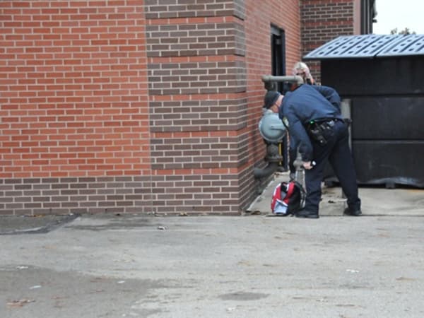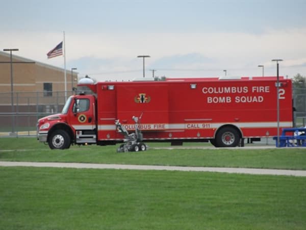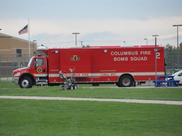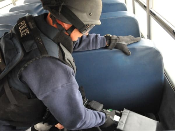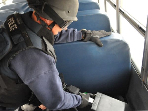 Columbus Bomb Squad Tech examines an IED found on the school bus.