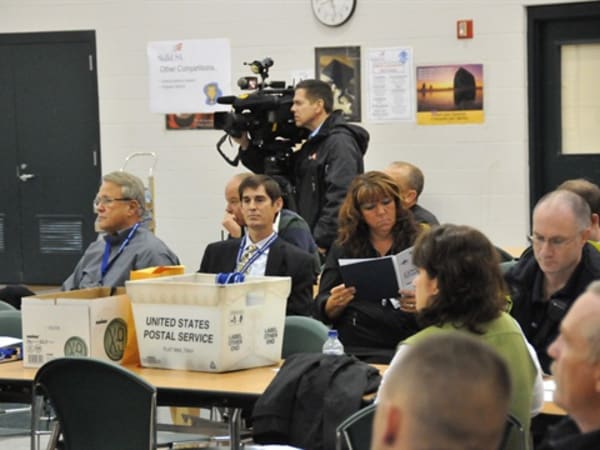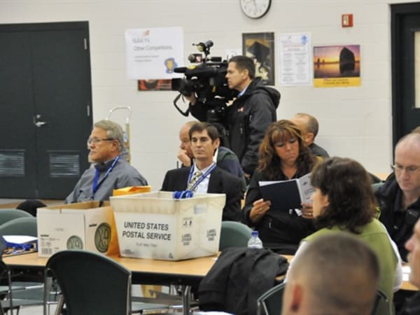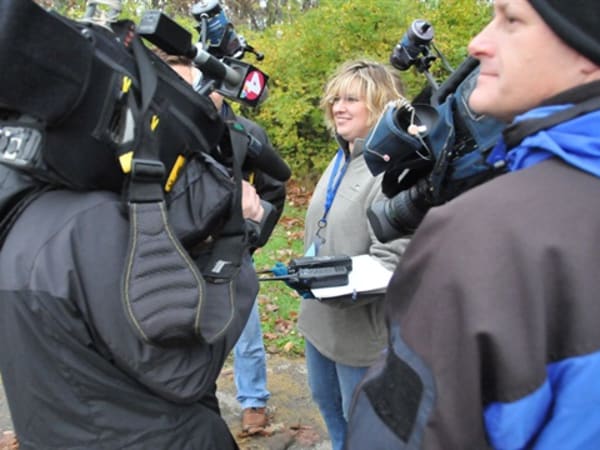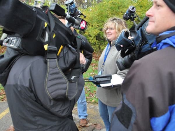 Left to right, Deputy Superintendent Phil Warner, Assistant Superintendent John Kellog and PIO Sandy Nekoloff during the morning briefing. The cameraman/reporter is from WCMH 4.