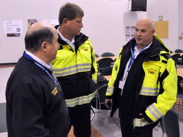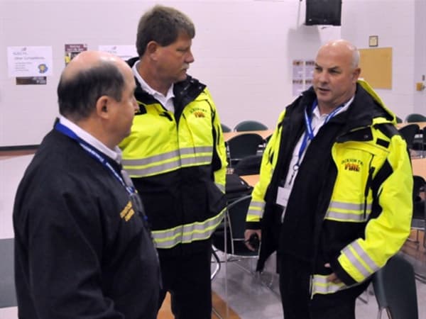 From left: Jackson Township Assistant Chief Rick Dawson, Chief Lloyd Sheets and Captain Merion Jacobs are discussing procedures after the briefing.