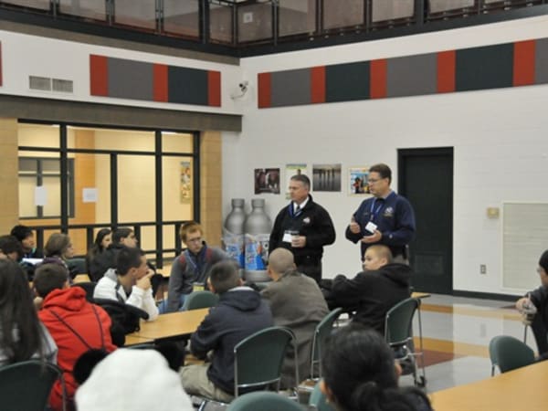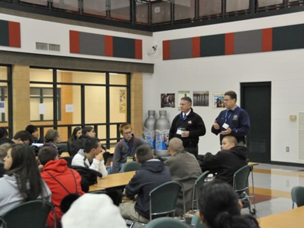 Left to right, Lt. Jeff Lawless, Grove City Police Department, and Gene Komondor, exercise director from All Hands Consulting, brief the high school students on their roles before the start of the exercise.