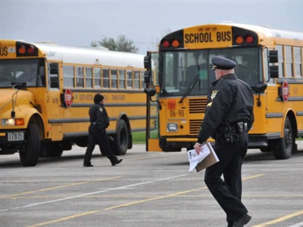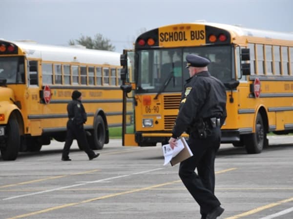 Officers from the Grove City Police Department prepare to escort students off the school bus and into a building for questioning.