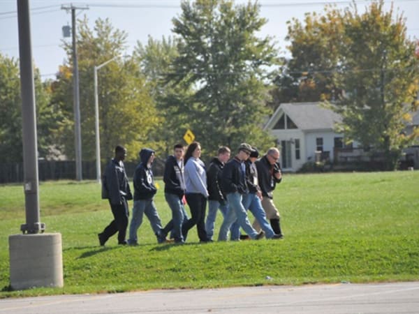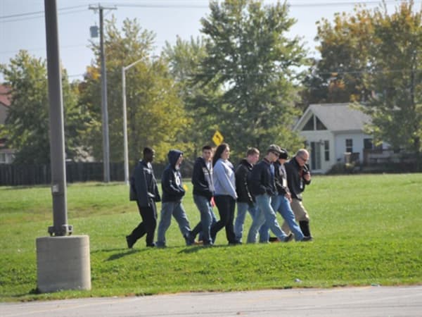 Students are escorted through the exercise area by Gary L. Sigrist Jr. to watch part of the exercise.