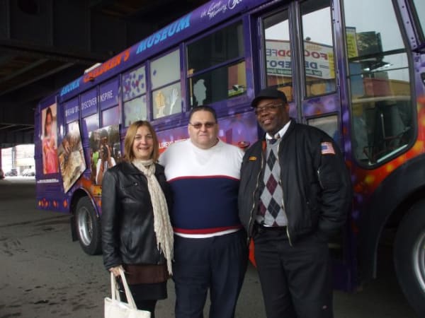 Atlantic Express offered to house the "art bus" on its Bronx lot and perform minor repairs. Pictured from left are Carla Precht, founding executive director of the museum, and Atlantic Express' Tommy Joy, terminal manager, and Walter Green, who drives the bus. For more on the museum, go to www.bronxchildrensmuseum.org.