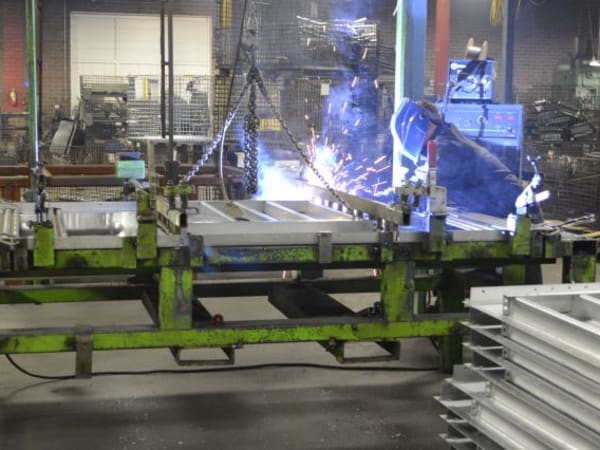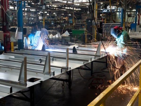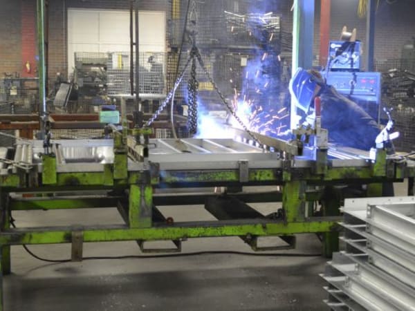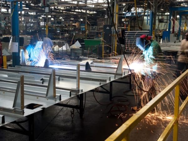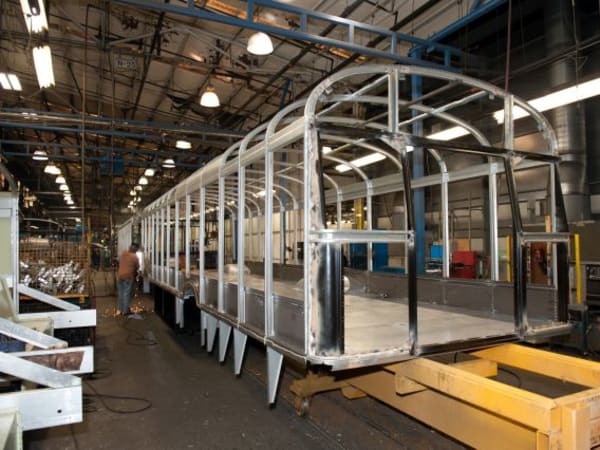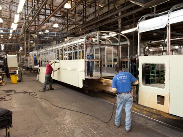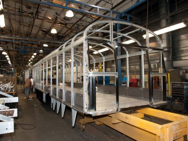 A worker welds a sidewall panel at Blue Bird South.