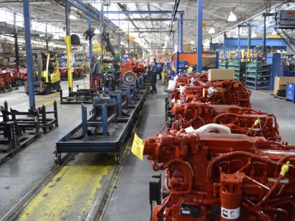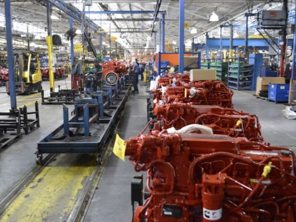 A line of Cummins engines await installation in Blue Bird buses.