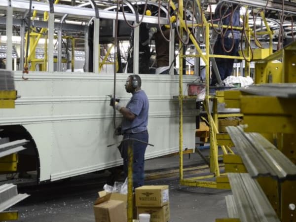 Blue Bird employees weld flooring for a school bus at the company's main facility in Fort Valley, Ga.