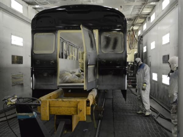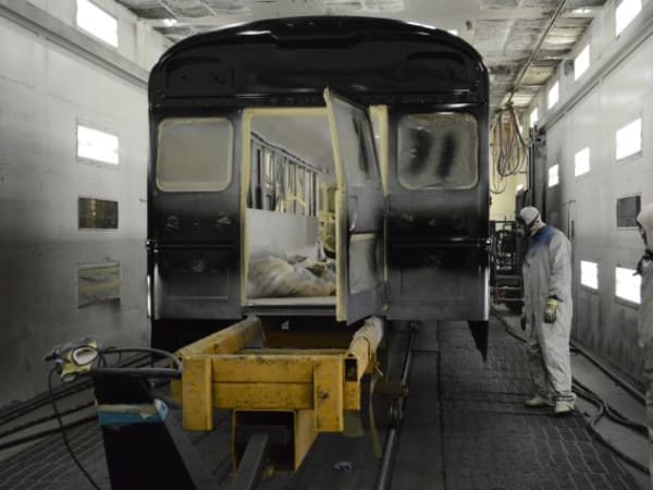 A bus gets a yellow coat inside a paint booth.