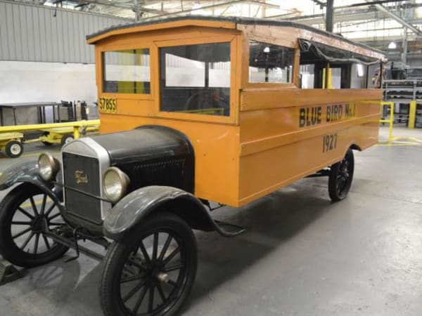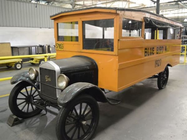 On display in the Fort Valley facility is a replica of Blue Bird No. 1, the company’s first school bus, which was built in 1927. The bus was mounted on a Ford Model T chassis, and it included a solid, one-piece roof bow design.