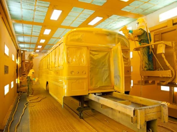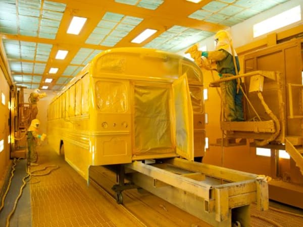 Inside a Blue Bird paint booth, a bus body gets a coat of black paint before the more prominent school bus yellow.