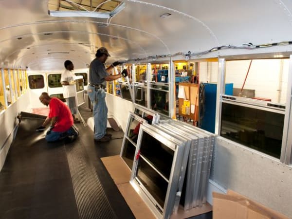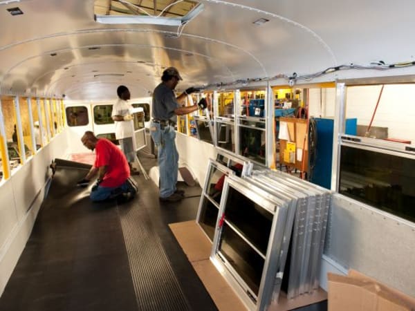 Body bows are installed on a Blue Bird bus.