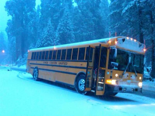 John Clements of Kings Canyon Unified School District in Reedley, Calif., sent us this photo. He says the shot was taken by Cindy Roberts while she stopped to check the bus' tire chains.