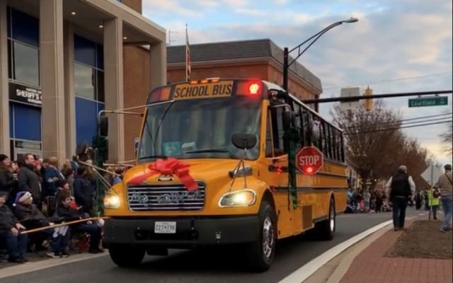 Mr. Grinch grabbed the wheel of a Thomas Built Saf-T-Liner C2 in the Bel Air, Md., holiday parade. He represented Nelson Bus Company, Nelson Training Center, and Harford County Public Schools.