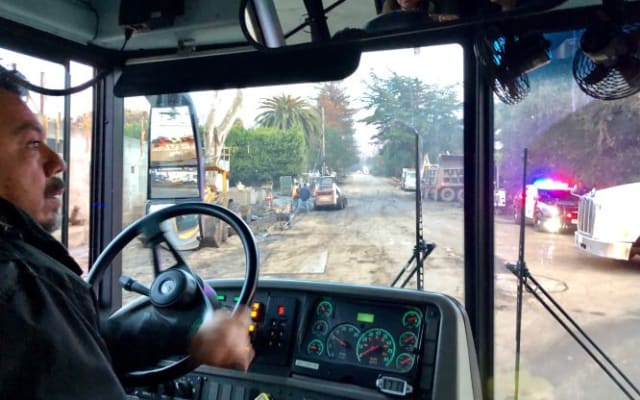 Carpinteria (Calif.) Unified School District school bus drivers transport critical personnel for their district and the area, traversing a wet, muddy section of Highway 101.