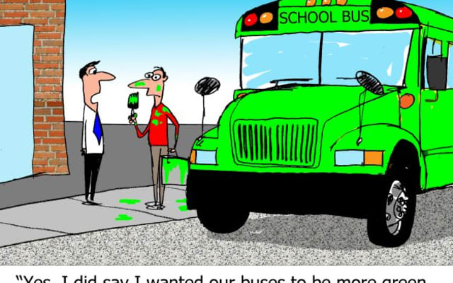 SBF’s monthly “BUSting Up” cartoon targets the humorous side of pupil transportation. The June through December 2017 entries cover “green” buses, budget woes, and a giant stop arm.