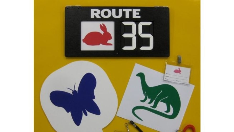 The Route ChangerXL Slide-In Sign Combination Sign assists in transporting young passengers. Coordinating Animal Sign products easily slide in and out of the sign, and the route number can be changed quickly.