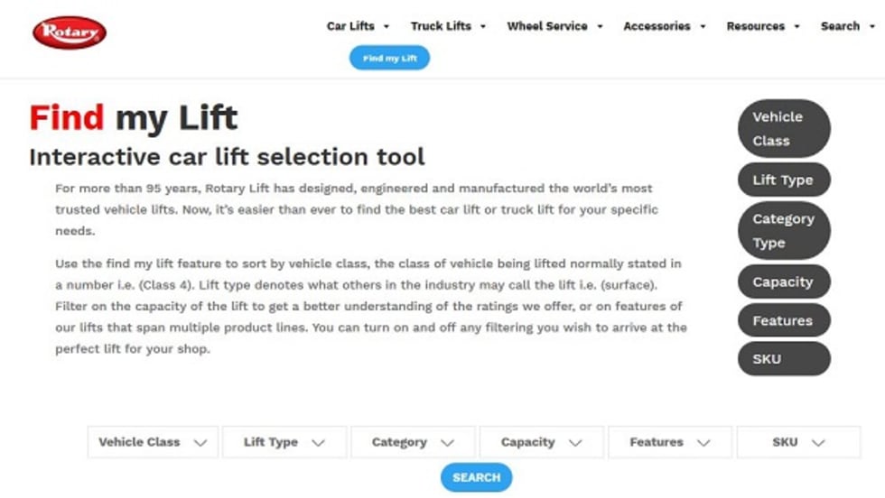 The digital “Find My Lift” tool from Rotary Lift allows users to search, sort, and browse for a vehicle lift that meets their specific needs.