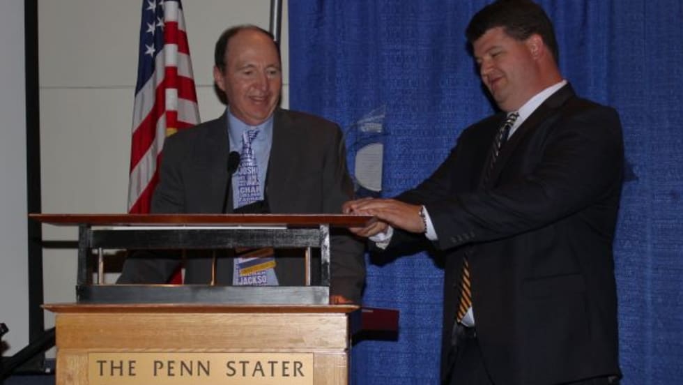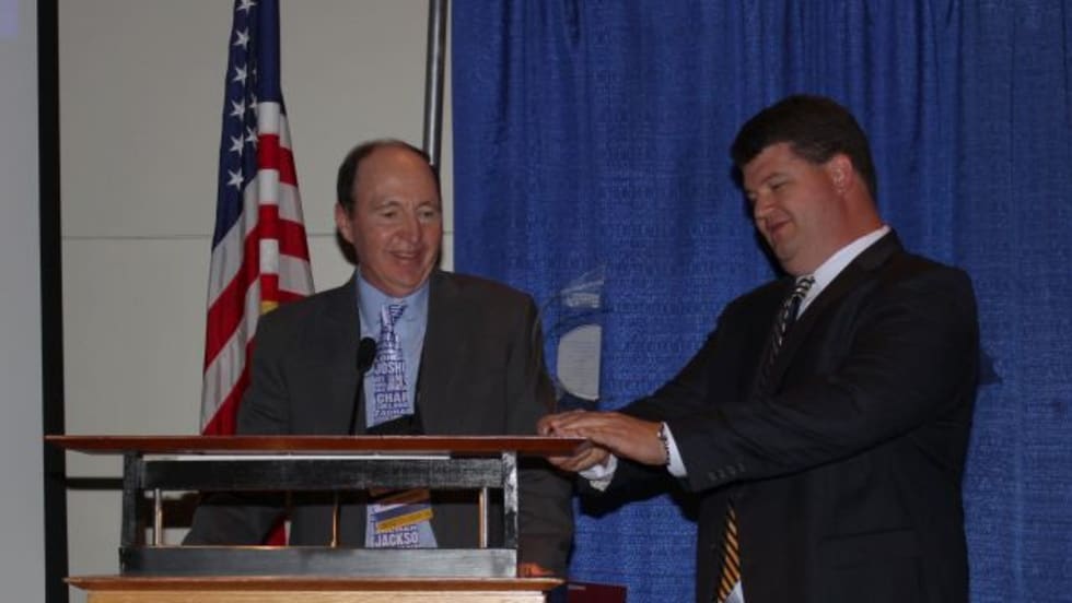 Randall Smith receives the “Bus Stops Here” honor for his contributions to association, including nearly 25 years of service on the board of directors.