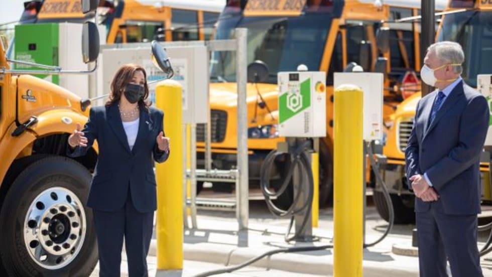 Harris meets with school bus manufacturer employees and parent company Daimler Trucks North America CEO, who detail the benefits of electric buses. Daimler also inaugurates its Electric Island vehicle charging station.