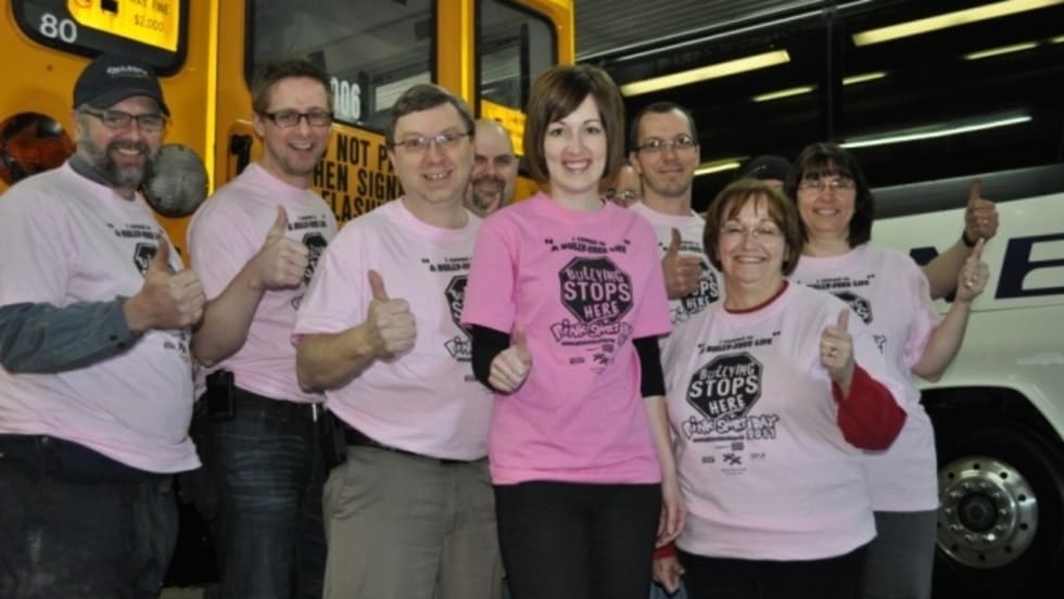 Delaney Bus Lines employees wear pink T-shirts on Feb. 23 in observance of Pink Shirt Day. The Canadian event originated from an incident several years ago when two students organized a protest to show support for a boy who was bullied for wearing a pink shirt to school.