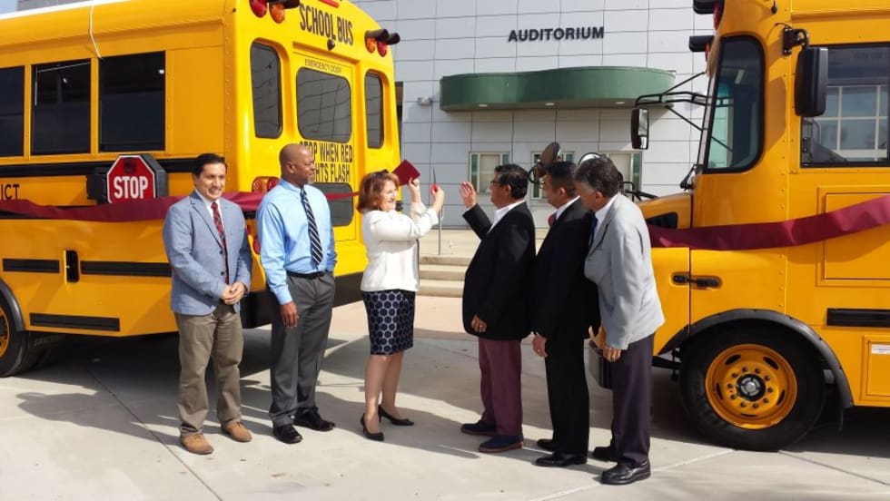 Colton Joint Unified School District marks the delivery of two electric school buses funded in part by state grants.