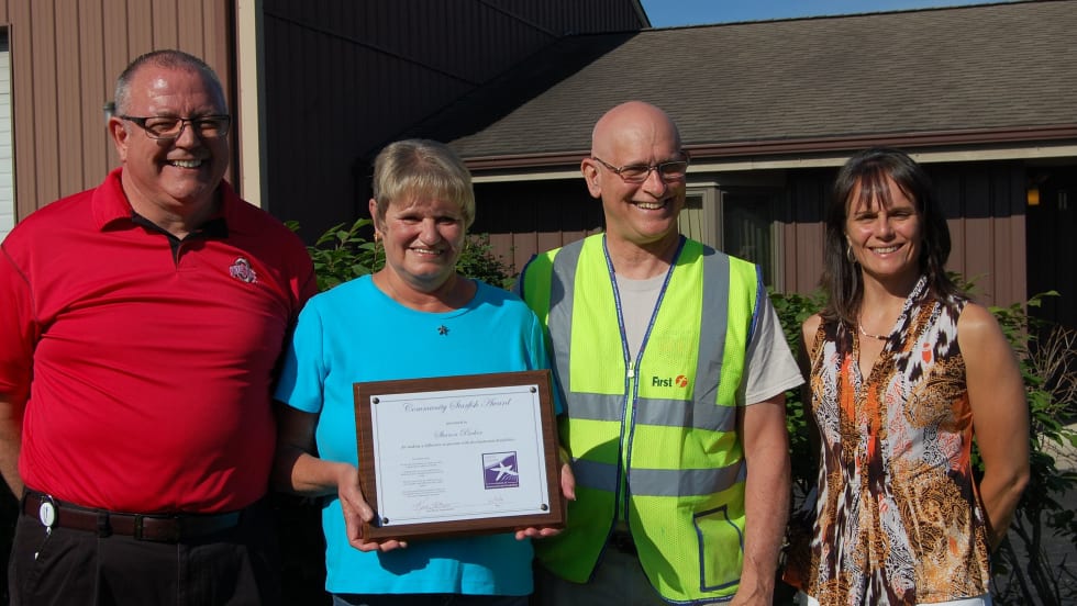 The Union County Board of Developmental Disabilities in Ohio presents Sharon Parker with a Community Starfish Award. Alan Mustard, First Student location manager, says Parker is “dedicated to the children she helps transport, and is committed to making riding the bus a positive experience by showing them care, compassion and respect.”