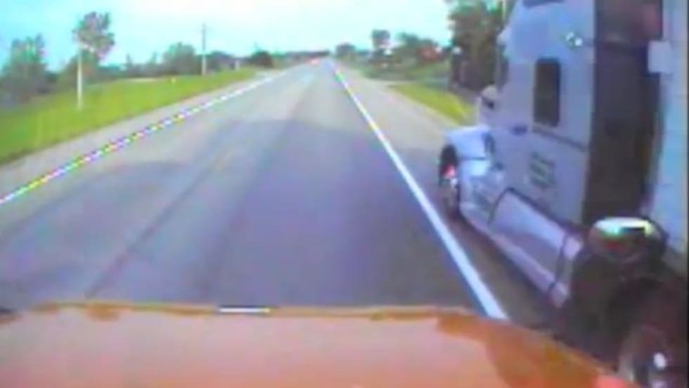 Authorities said that a semi truck illegally passed a stopped school bus (which had its lights flashing and stop arm extended) on May 30, nearly hitting a young female student waiting on the side of the highway near Paynesville, Minn.