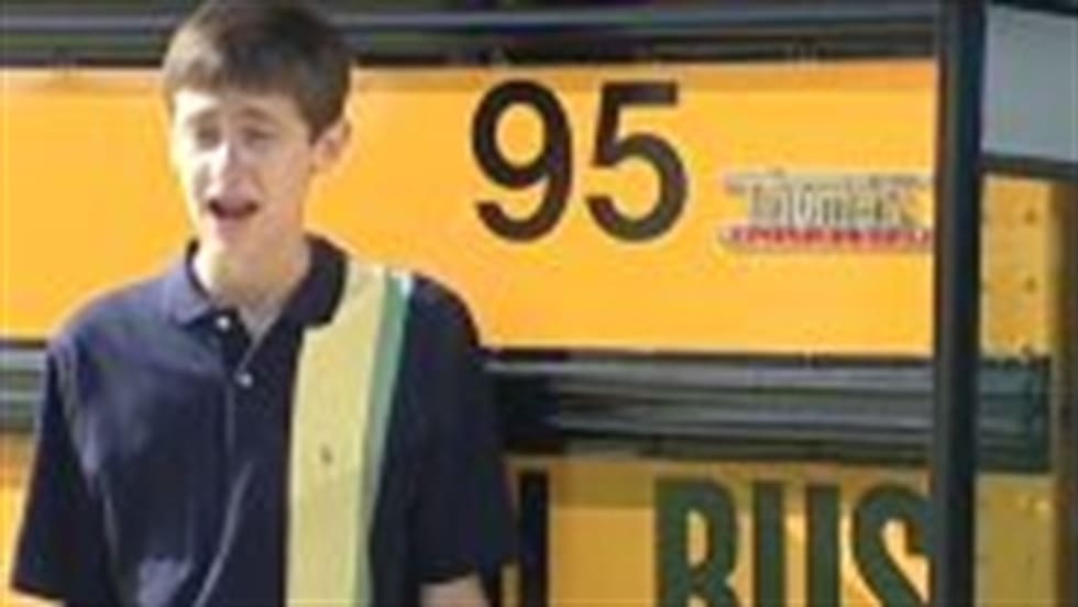 Matthew, the "School Bus Safety Kid" teaches his fellow students how to ride the yellow bus properly and safely.