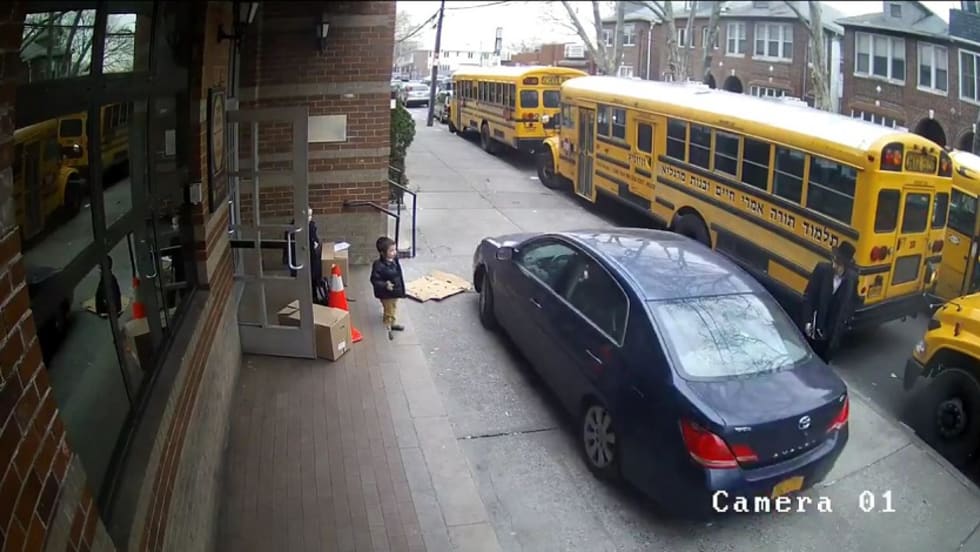 Video footage shows students walking across the sidewalk when the motorist approaches and waits for several to run in front of the vehicle before driving past them.
