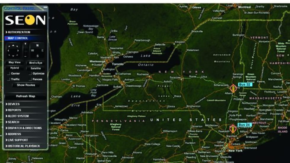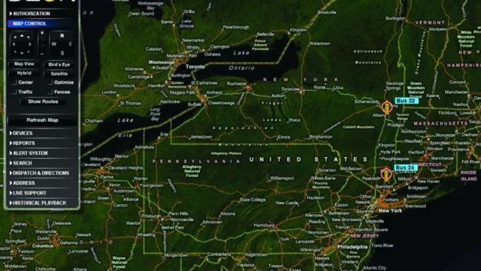Live reporting features include vehicle speed and direction, idle time, ignition status, route mileage and aggressive driving. With geo-fencing, users can set up a designated area and if a vehicle travels beyond this point, the system administrator is notified via email or text message.