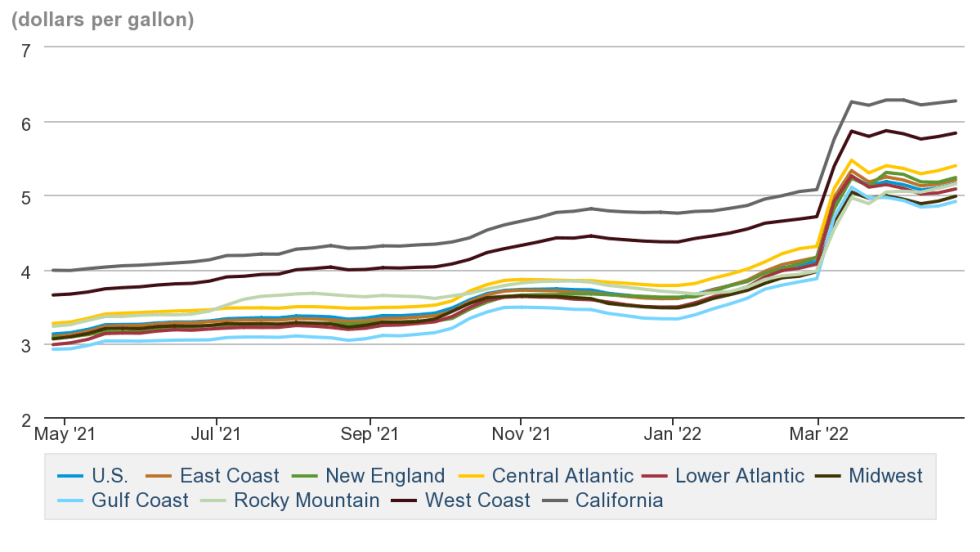 The national average diesel price at the pump topped the $5 mark for the first time in the week reported March 14, at $5.25. It has remained over $5 a gallon ever since.