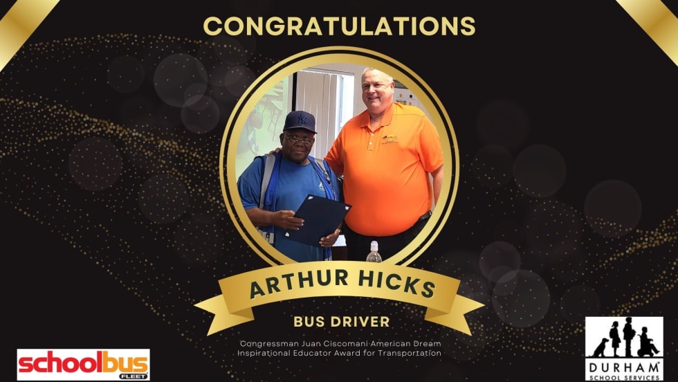 Arthur Hicks has been driving the big yellow bus for Durham School Services in Arizona for eight years. This award recognizes his commitment to Casa Grande Union High School Students and the community and their safety.