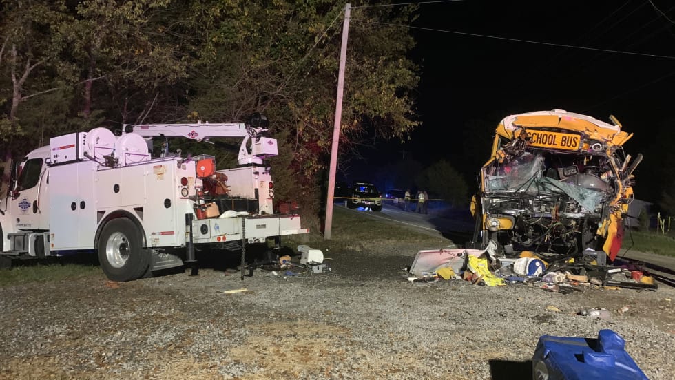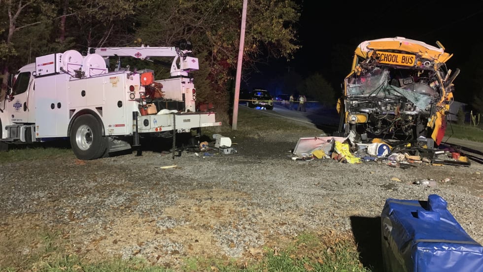 A utility service vehicle collides with a Meigs County Schools bus, killing the bus driver and a 7-year-old student.
