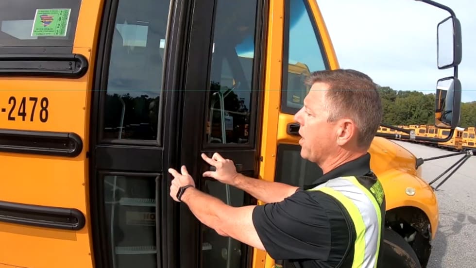 John Smith, bus safety officer for Greenville (S.C.) Public Schools, provides a refresher for staying safe on the school bus.