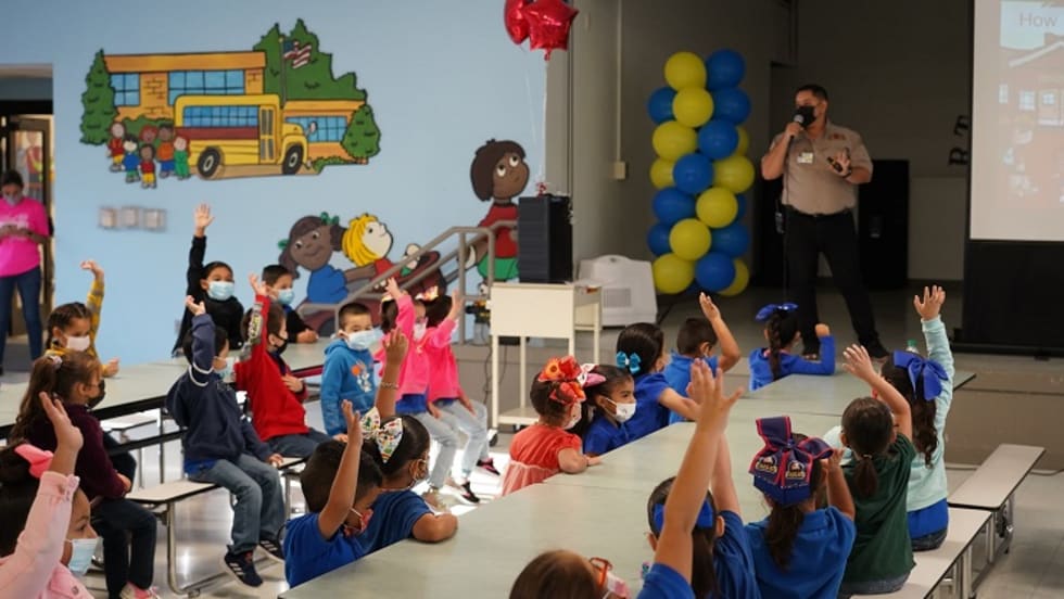 Bus drivers from Calcasieu Parish (La.) Schools put on a skit with Buster the Bus for students during National School Bus Safety Week.