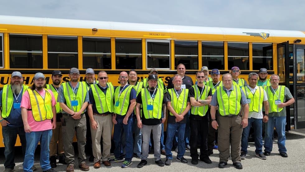 The contractor fleet's maintenance workers got hands-on training with servicing different engines, transmissions, and other school bus components.